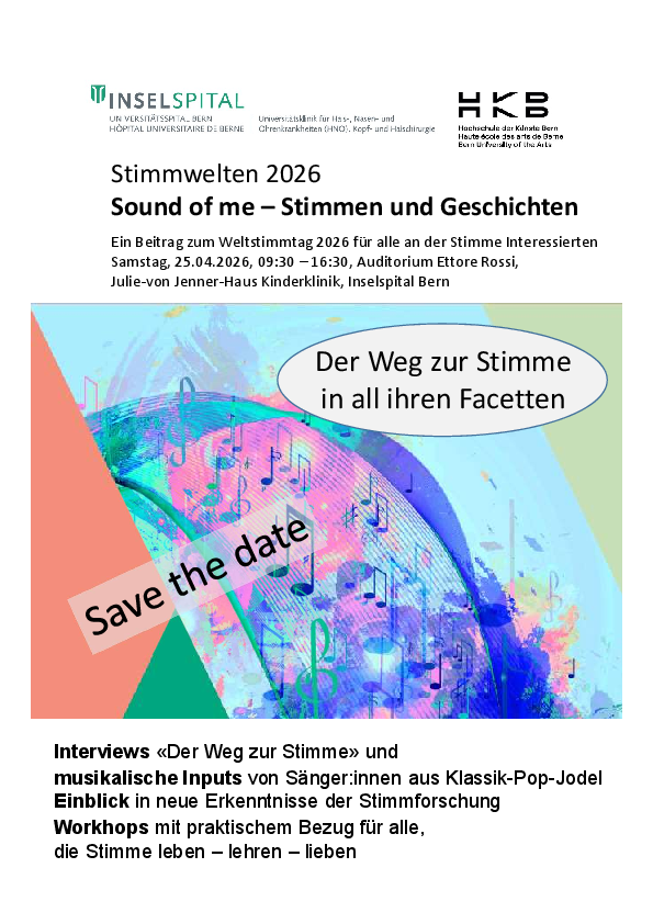 Ein Beitrag zum Weltstimmtag 2026 für alle an der Stimme Interessierten Samstag, 25.04.2026, 09:30 – 16:30, Auditorium Ettore Rossi, Julie-von Jenner-Haus Kinderklinik, Inselspital Bern